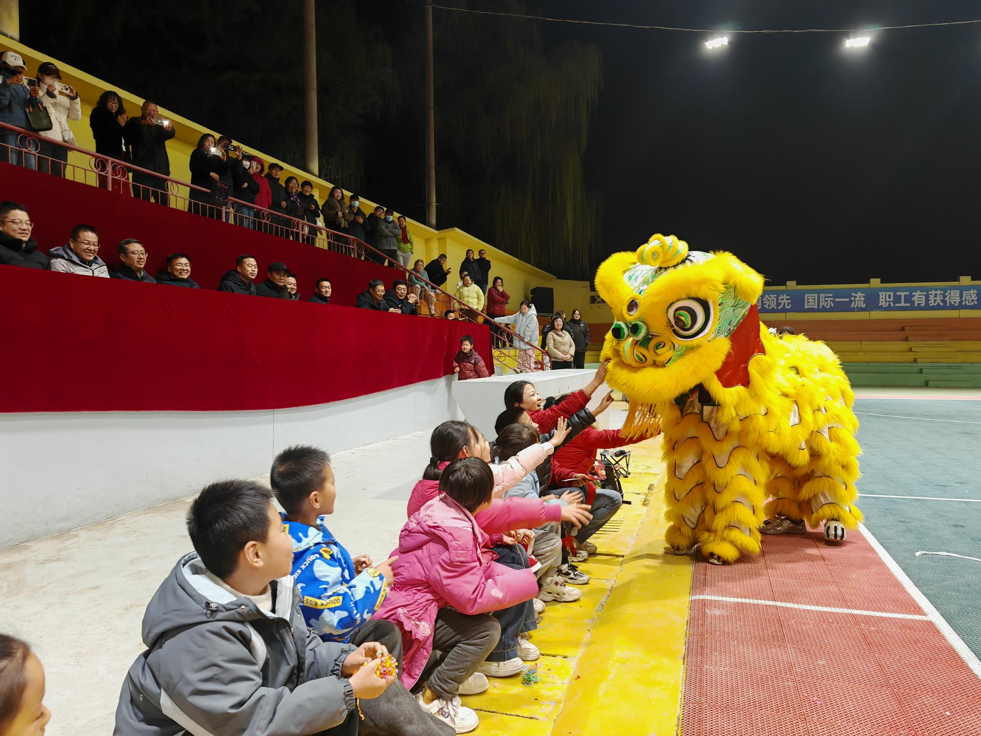 晚上7点,宝钛老区灯光球场华灯璀璨、人潮涌动,元宵游园活动在喜庆欢快的舞蹈《开门红》中正式拉开帷幕。气势磅礴的《彩龙舞东方》惊艳登场,飞天龙灯在夜空中盘旋升腾,瞬间点燃全场热情;刚柔并济的《太极表演》行云流水,尽显宝钛人干事创业张弛有度、步履铿锵的精神风貌;舞蹈《盛世欢歌》《舞动钛城》节奏明快、活力四射,生动展现钛城儿女昂扬向上、奋发有为的时代风采;紧接着登场的舞龙表演腾跃穿梭、气势如虹,将现场氛围一次次推向高潮;古韵十足的《大唐百戏》妙趣横生,带领观众沉浸式穿越市井繁华;两只醒狮腾挪跳跃、威武灵动,与现场观众热情互动、纳祥送福,最终狮口吐幅——“恭喜发财 万事腾意”的美好祝福引发全场阵阵欢呼。