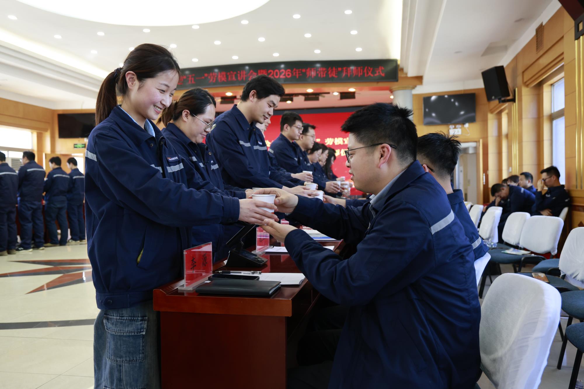 在庄重肃穆的乐声与全体人员的见证下,拜师仪式正式开始。青年员工们整齐列队,面向师傅,行上庄重的拜师礼。随后,师徒双方共同签订《师徒协议》,将口头的承诺转化为书面的契约,也将一份沉甸甸的责任共同扛起。这薄薄的一纸协议,承载的是技艺的传承、作风的熏陶和精神的接续,标志着陕西锌业“尊师重道、薪火相传”的优良传统在新一代职工中正式生根发芽。