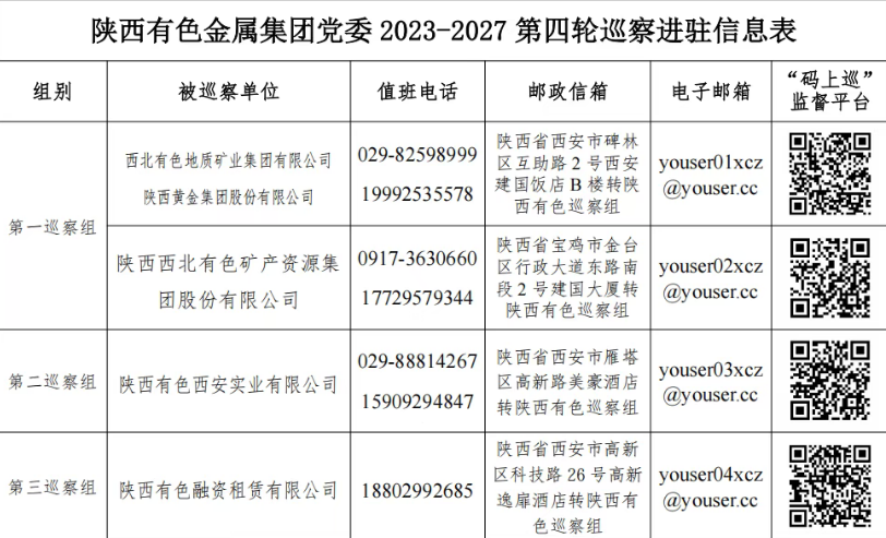 近日,陕西有色金属集团党委2023-2027第四轮巡察完成进驻,根据集团党委统一部署,本轮巡察共派出3个巡察组,分别对地矿集团、黄金集团、西安实业3家单位党组织开展常规巡察,对融资租赁党支部进行巡审联动,西北资源开展提级巡察,曲江聚联实业开展专项巡察。