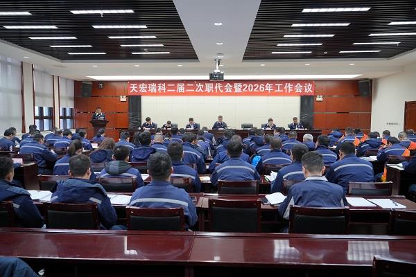 1月27日,天宏瑞科二届二次职代会暨2026年工作会议在公司行政楼四楼多功能会议室召开。会议传达了集团公司三届四次职代会暨2026年工作会议精神和集团公司安全环保会议精神。公司党委书记、董事长、总经理徐岩出席并讲话,其他领导班子成员安排部署了2026年分管领域重点工作,党委副书记、工会主席杨俊斌主持会议。