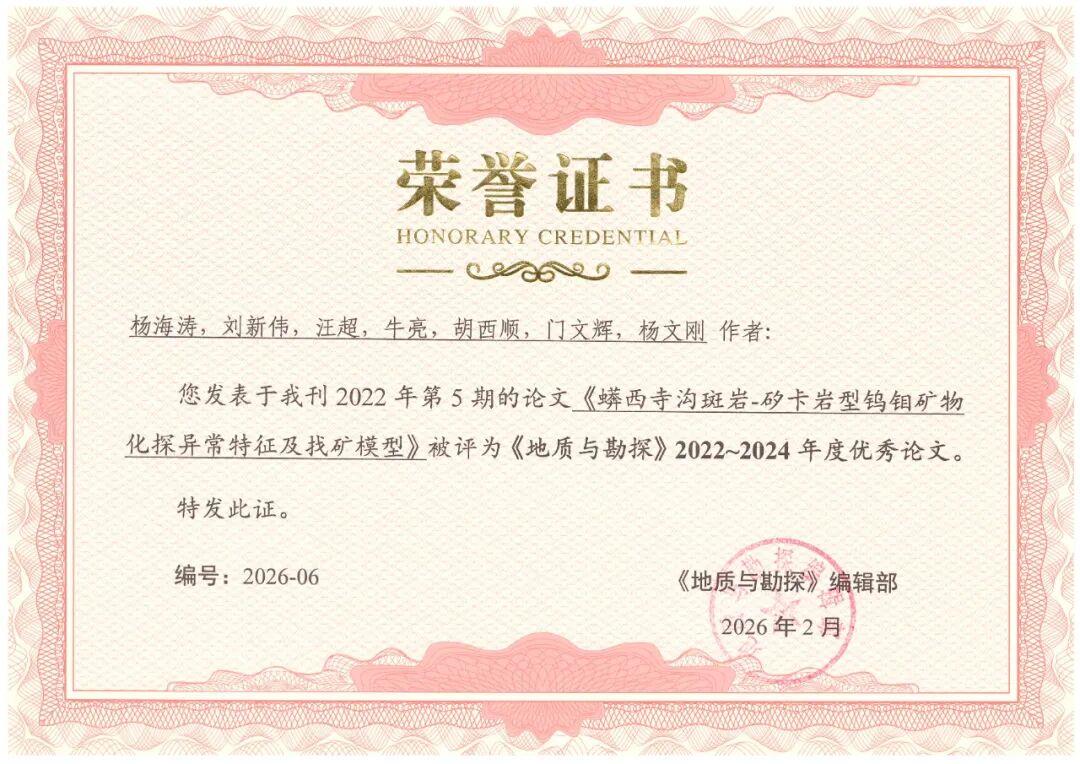 近日,中国科技核心期刊与中文核心期刊——《地质与勘探》公布了2022-2024年度优秀论文评选结果。研究院公司职工杨海涛等人撰写的《蠎西寺沟斑岩-矽卡岩型钨钼矿物化探异常特征及找矿模型》一文获评“优秀论文”。